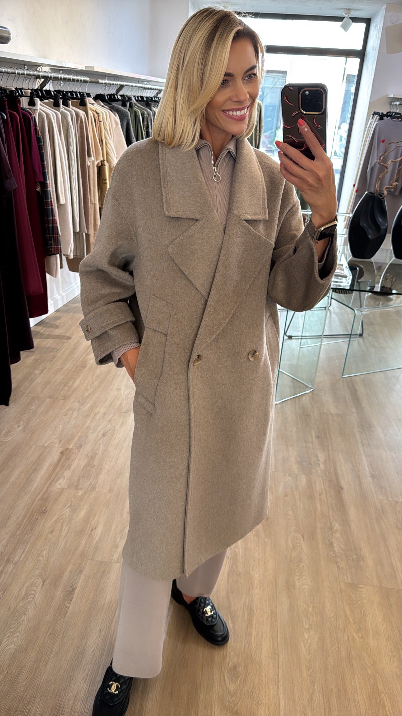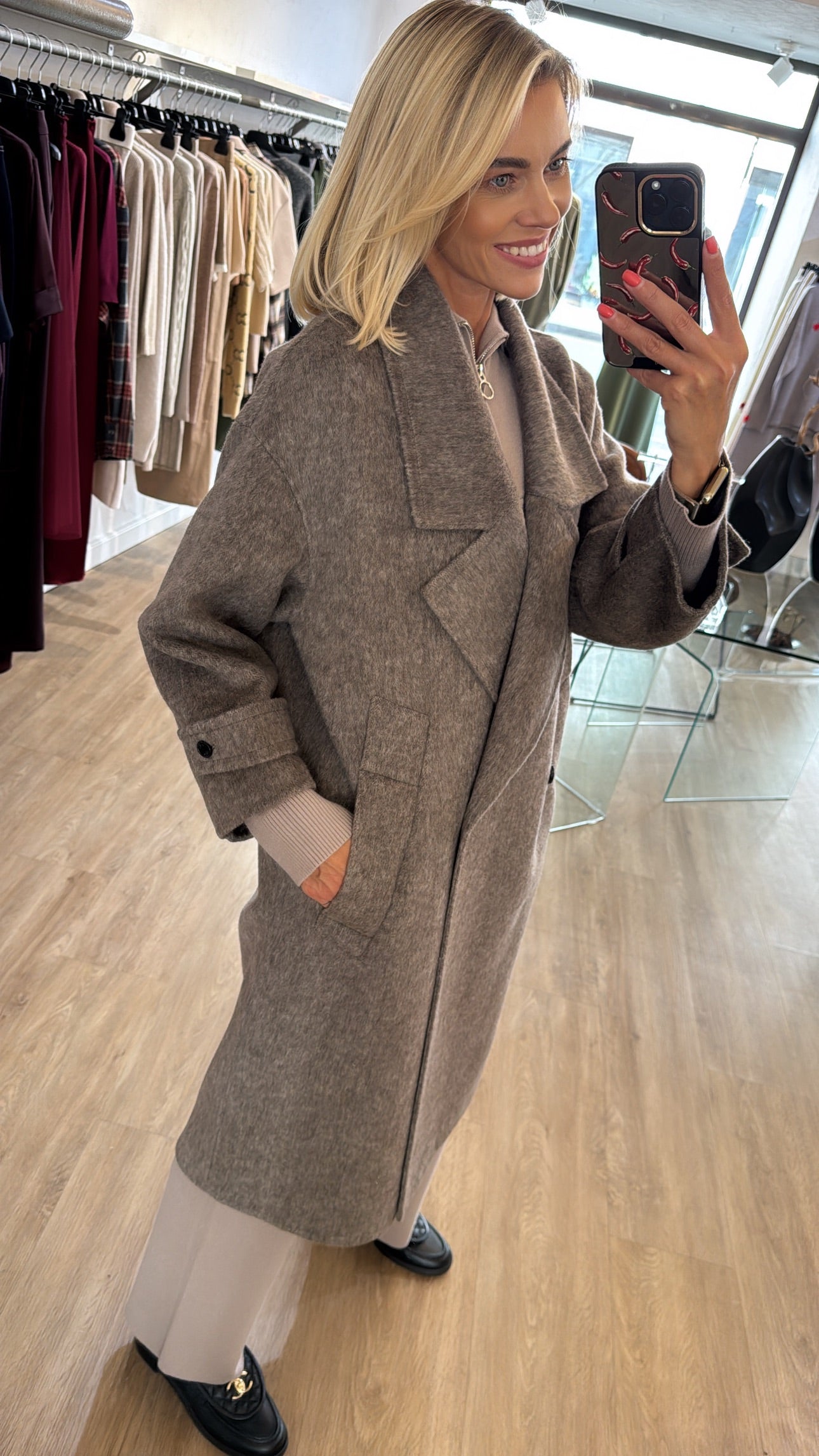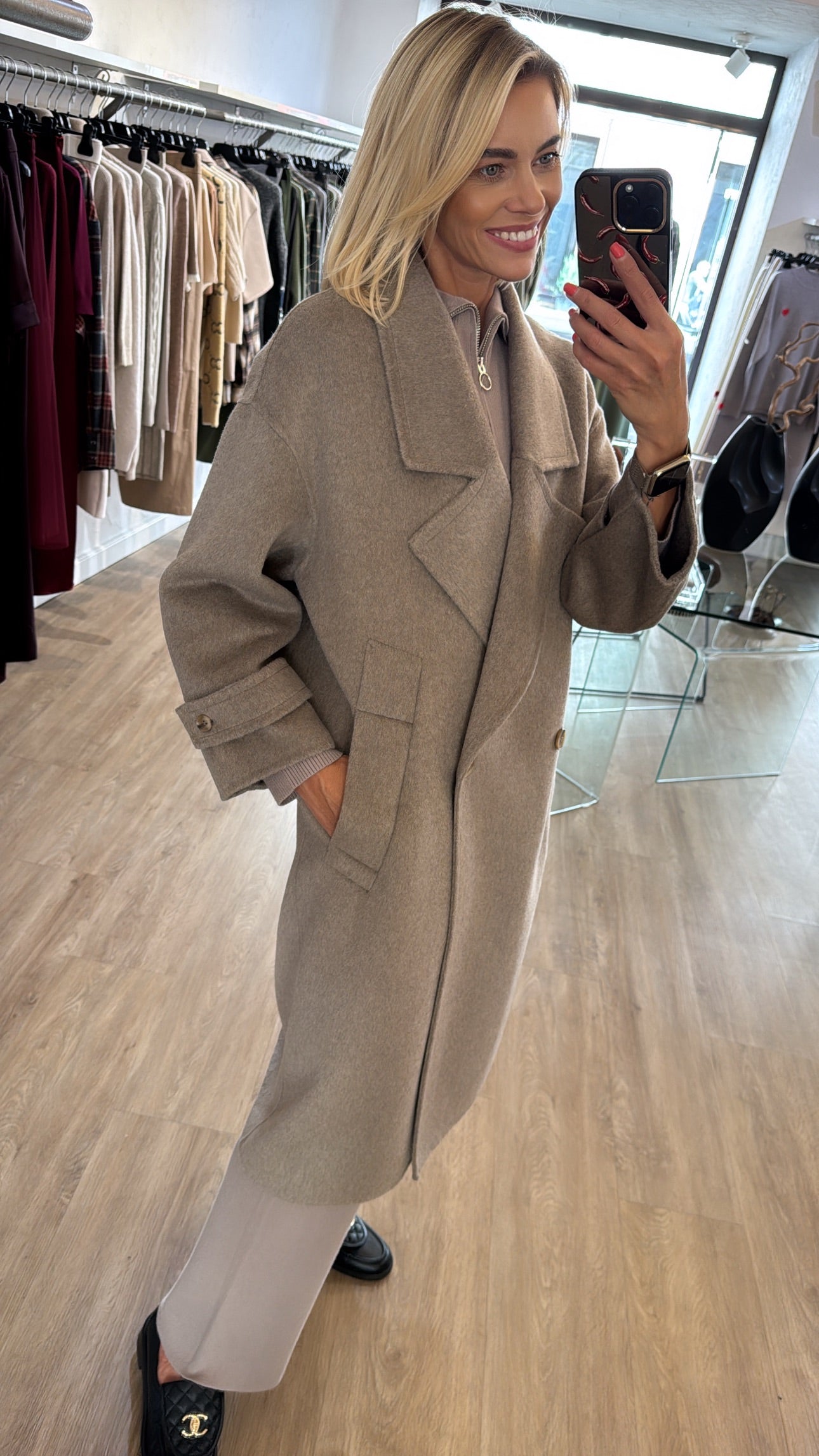 50% lana vilna 50% poliesteris. Paltas yra rankų darbo, jo modelis yra padidintas, laisvesnis, palto dydis tiks nuo xs iki L dydžio.