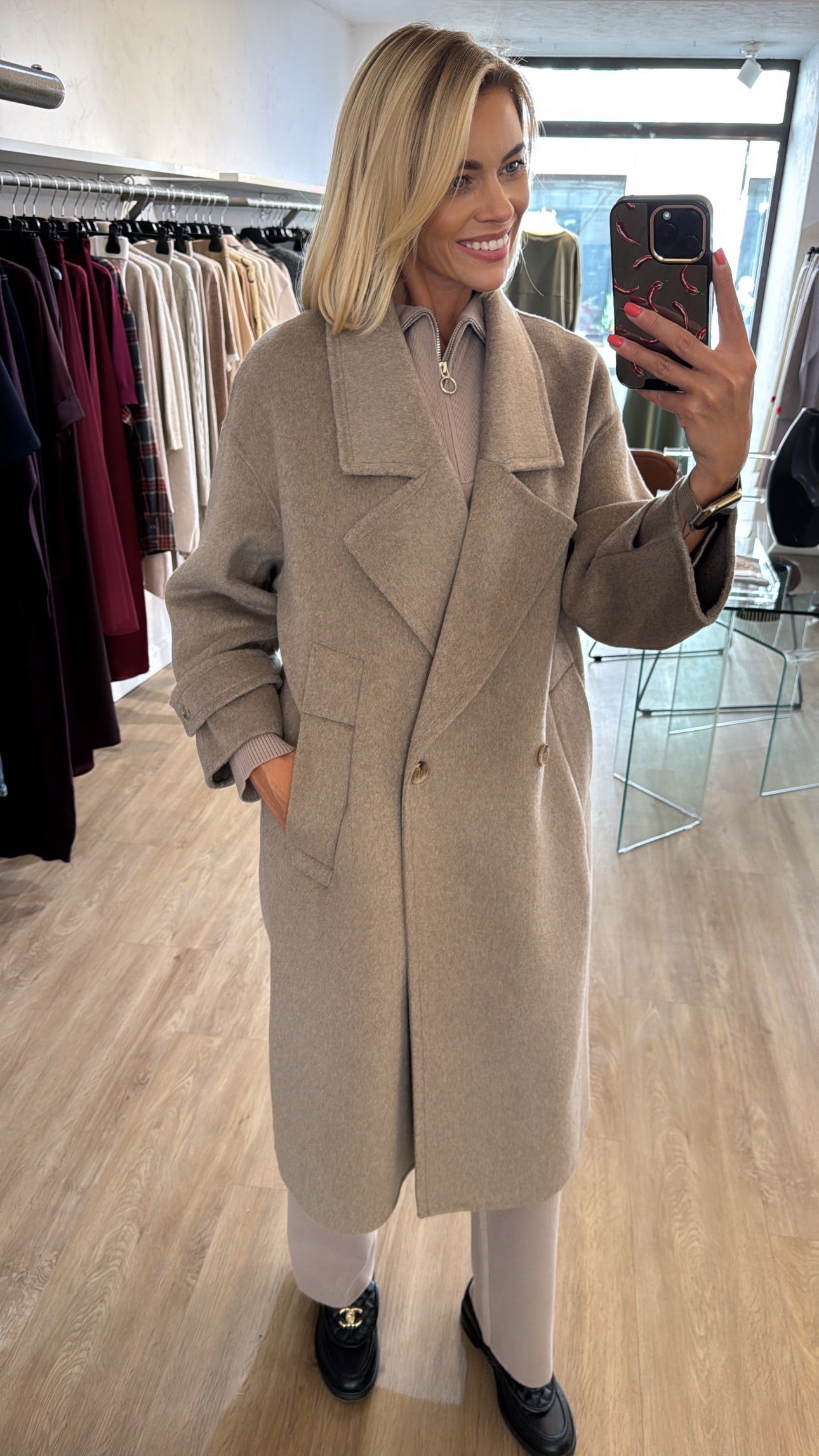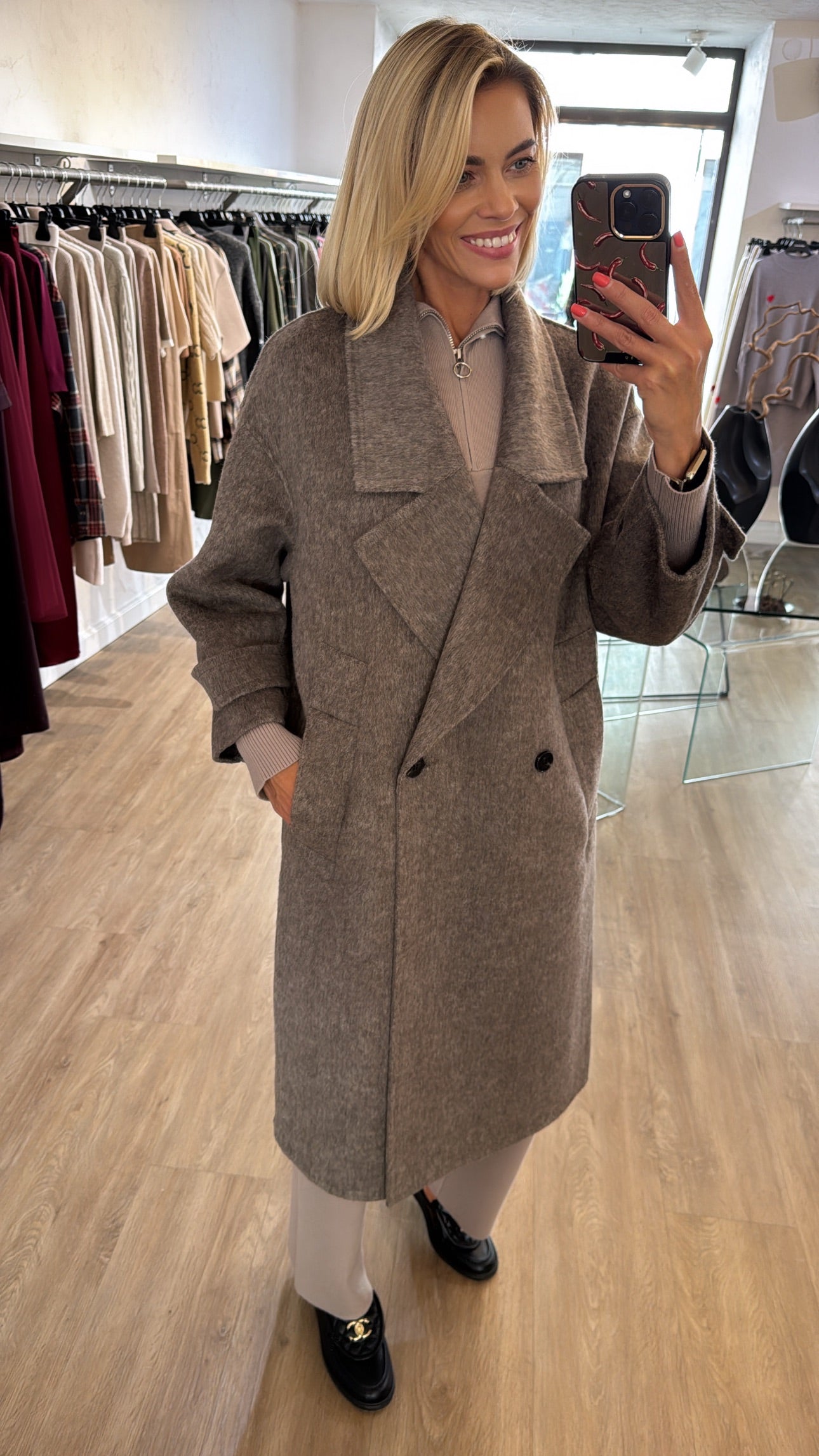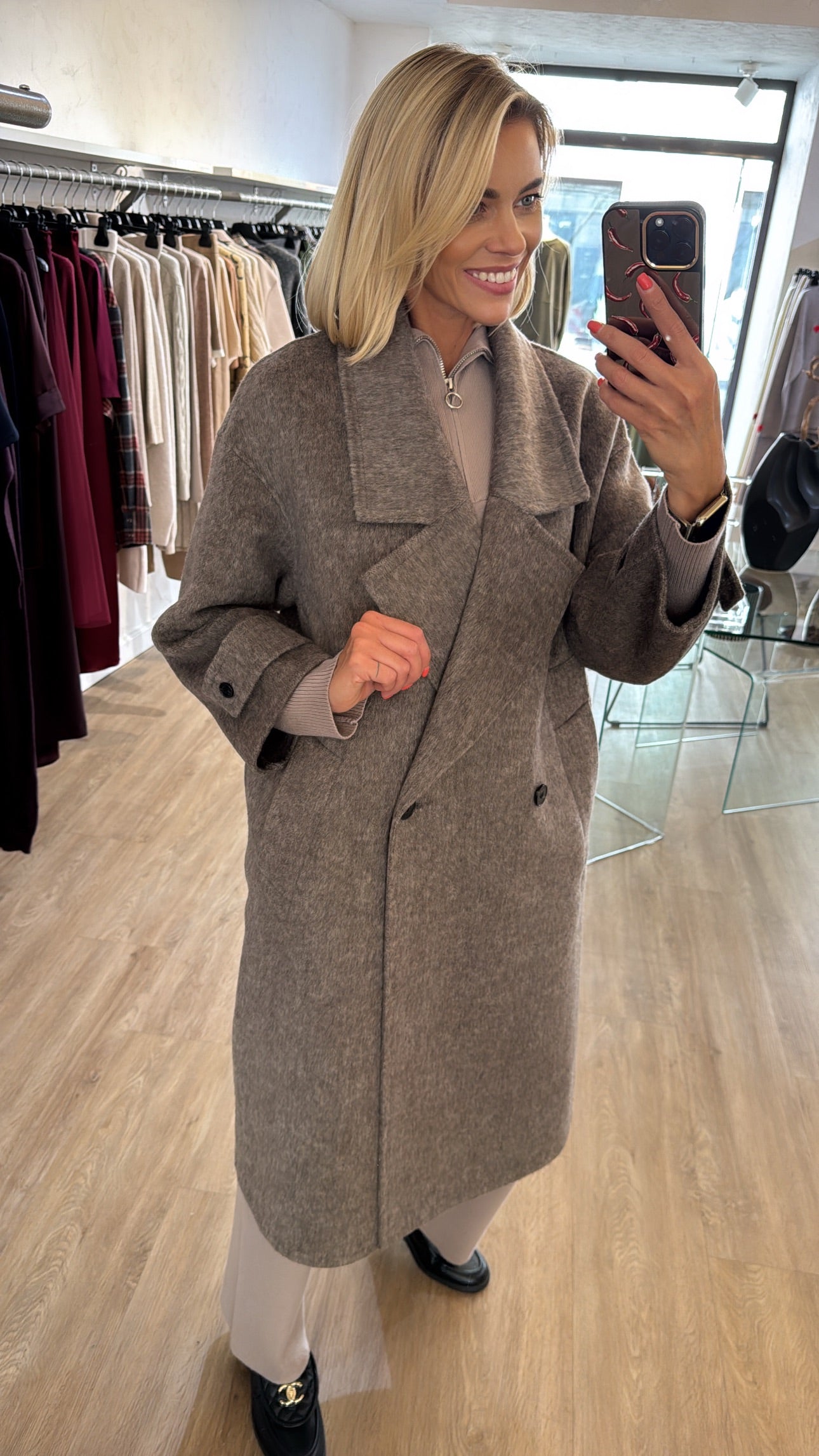 50% lana vilna 50% poliesteris. Paltas yra rankų darbo, jo modelis yra padidintas, laisvesnis, palto dydis tiks nuo xs iki L dydžio.